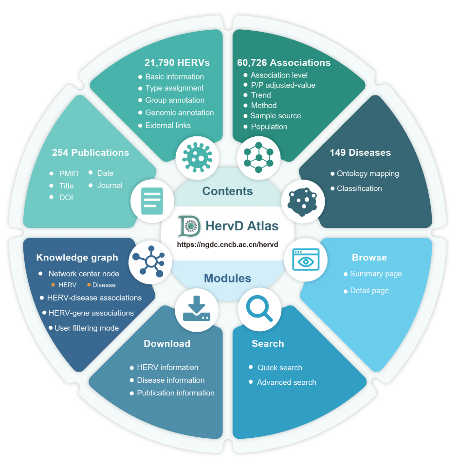 人内源性逆转录病毒(HERVs)是远古时期外源性逆转录病毒感染宿主生殖细胞或胚胎干细胞并整合到人类基因组上的前病毒序列,近年研究表明其在正常生理和病理发展等重要生命过程中发挥重要作用。为此,NGDC与本所陈非团队合作开发了人类内源性逆转录病毒相关疾病知识库HervD Atlas,整合250多篇HERVs相关疾病研究文献数据,通过人工审编获得60,726条高质量的HERVs与疾病关联条目,涵盖21,790种HERVs,149种疾病和610个受影响基因。该数据库系统整合HERVs、疾病和基因的关联信息,构建了交互式知识图谱,为关联知识整合及推断提供了界面友好的可视化平台。该成果以“HervD Atlas: a curated knowledgebase of associations between human endogenous retroviruses and diseases”为题在Nucleic Acids Research 在线发表。