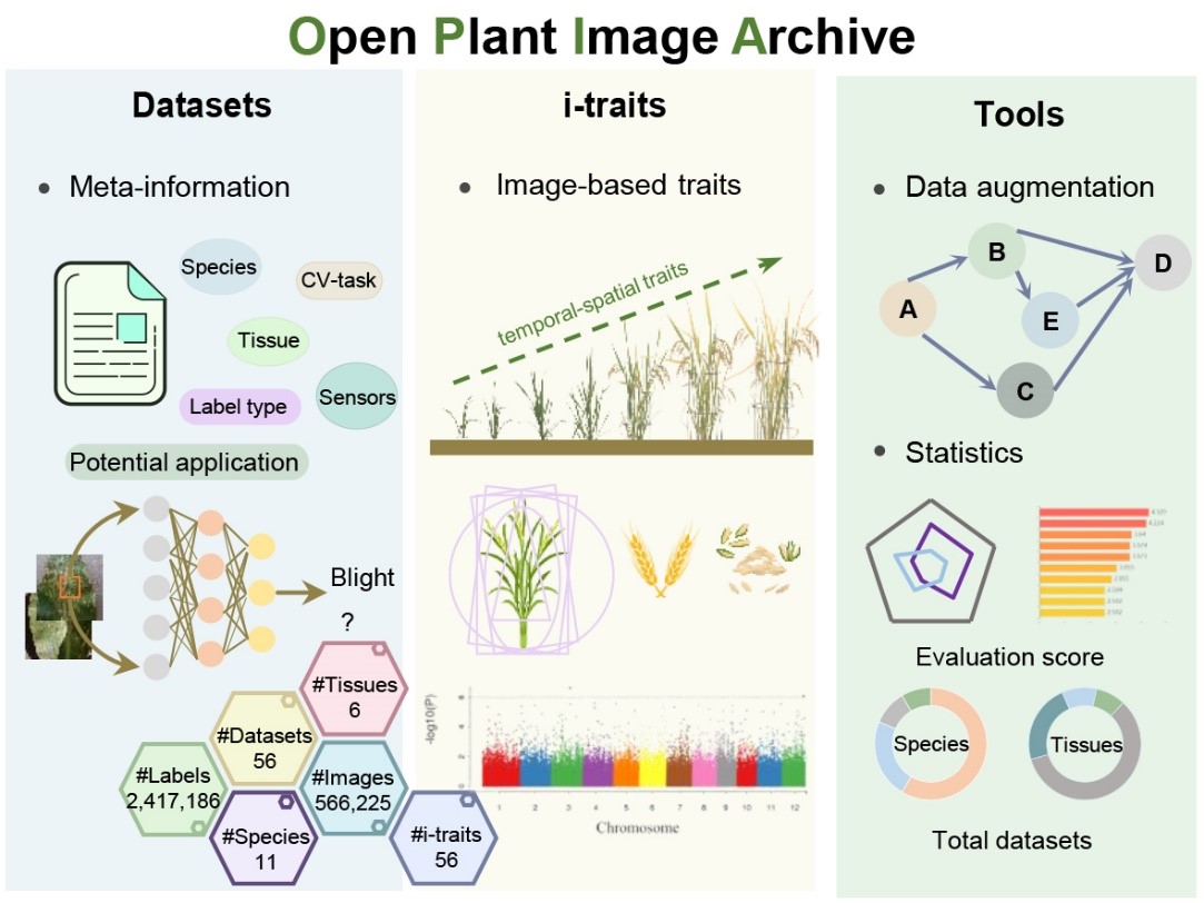 随着高通量植物表型采集技术在植物表型组学研究中的广泛应用,产生了大量的图像和基于图像的性状数据,这些数据是种质筛选、植物病虫害鉴定、农艺性状挖掘等应用的重要资源。为此,NGDC与中国科学院遗传发育所胡伟娟团队合作开发了植物图像及相关性状开放归档库OPIA,为国内外科研人员提供植物图像及相关性状数据递交与共享的公共服务。OPIA采用标准化人工审编流程整合了56个高质量的植物图像数据集,涵盖11个物种、6种组织类型,总计566,225张图像、2,417,186个注释实例。通过对来自不同传感器类型的图像样本及相应标签数据的运用,有利于促进研究人员进一步提高智能预测方法的精度,揭示植物生长的动态规律,进而推动全球植物表型组学领域的创新和发展。该成果以“OPIA: an open archive of plant images and related phenotypic traits”为题在Nucleic Acids Research在线发表。