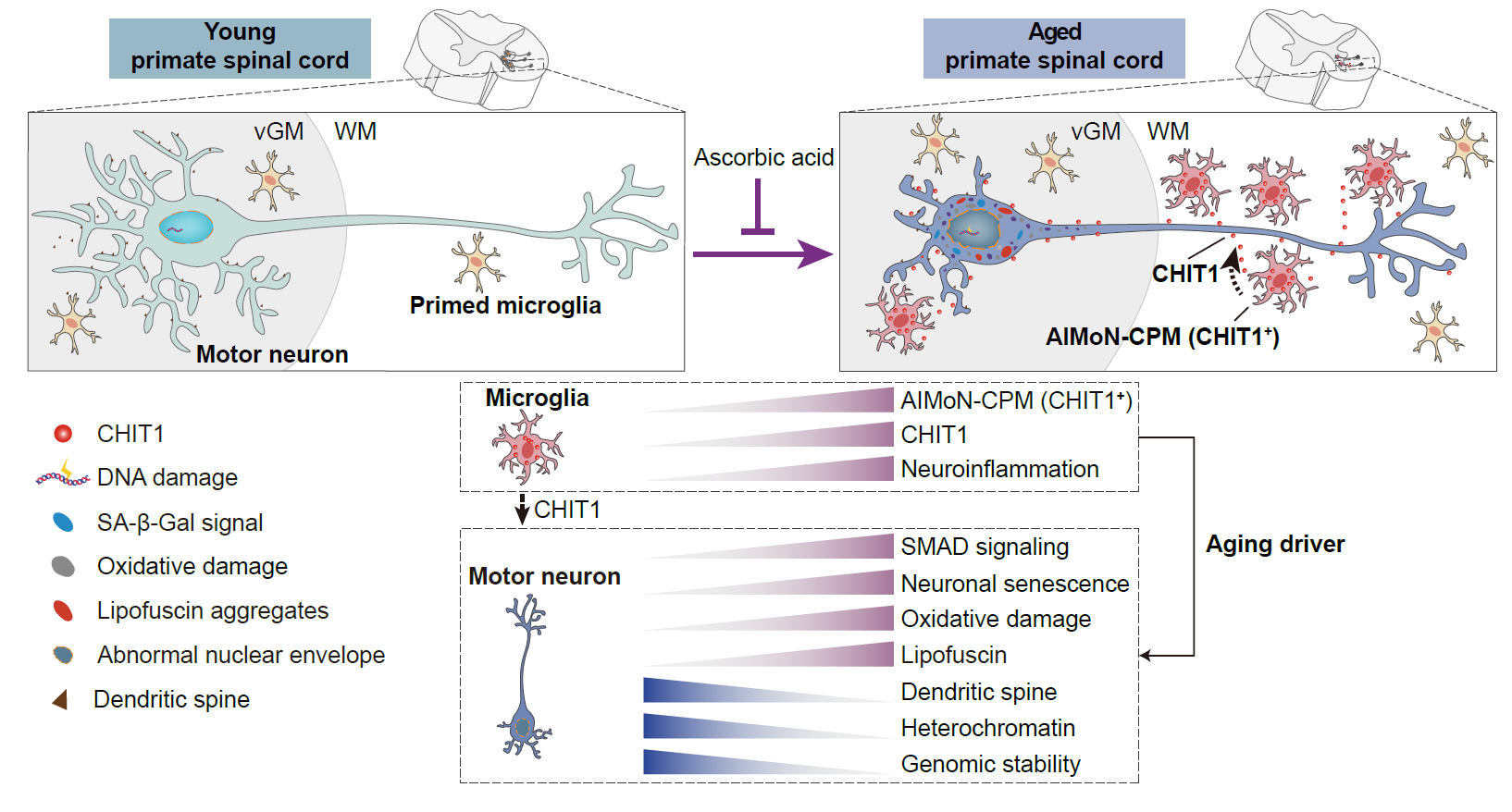 2023年10月31日,中国科学院北京基因组研究所(9323彩票)张维绮研究组与中国科学院动物研究所刘光慧研究组、曲静研究组合作在Nature 在线发表了题为CHIT1-positive microglia drive motor neuron aging in the primate spinal cord的研究论文。该研究历时7年,通过综合运用单细胞核转录组、神经组织学、神经电生理等技术手段,发现一群全新的在年老的灵长类动物的脊髓中特异存在的CHIT1阳性小胶质细胞亚型,并将其命名为AIMoN-CPM(Aging-Induced Motor Neuron toxic CHIT1-Positive Microglia),这类细胞可以通过旁分泌CHIT1蛋白激活运动神经元中的SMAD信号,进而驱动运动神经元衰老,而补充维生素C可抑制脊髓运动神经元的衰老和退行。