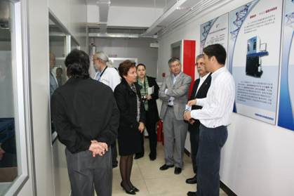 副所长于军研究员代表基因组所对墨西哥代表团的访问表示欢迎,在简要介绍了中国科学院生命科学方面的研究所的情况后,他向来宾重点介绍了基因组所的发展历史、研究领域与发展方向、科研条件等。代表团对基因组所几年来所完成的科研工作表示赞扬,宾主双方围绕基因组学和生物信息学的发展,基因组学和生物信息学在农业、医学等领域的重要应用以及双方未来在这些领域开展合作的可能性等进行了详细的交流和讨论。随后代表团一行人参观了基因组及生物信息学平台、大型计算机房、基因组稳定性项目组等实验室。