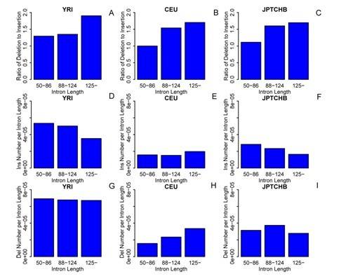 此次博士生王大鹏等的发现:出现在长度范围为88-124nt上的小内含子的删除/插入比值要高于50-86nt;另外,出现在GC含量(鸟嘌呤和胞嘧啶所占的比例)小于65%的小内含子上的删除/插入比值要高于GC含量大于65%的。进一步发现这两种效应可以在某种程度上得以区分但是并不能完全独立存在。这可能是因为一些GC富集的小内含子在长度上受到较弱的纯化选择,而在GC含量方面受到了较强的正选择。