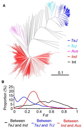 韩斌项目组在上一年开展的中国水稻地方品种重测序和全基因组关联分析的研究基础上(论文发表在2010年Nature Genetics),又收集了来自世界各国的水稻种质资源,挑选了950份较有代表性的水稻品种,利用新一代基因组测序技术和自行开发的用于基因分型和缺失数据修复的算法,构建了一张精确的水稻高密度基因型图谱,结合对水稻材料的群体遗传学分析,该项目组准确鉴定了一些可能影响水稻群体分化的基因组区段和候选基因。通过对这950份水稻品种的农艺性状进行了考察,包括抽穗期和十种籽粒性状(包括产量、品质和颜色等三类性状),我们在粳稻群体、籼稻群体和整个水稻群体中分别进行了全基因组关联分析,鉴定到多个新的关联位点。我们同时开发了一种基于单体型分析的局部基因组组装方法,对基因区的不同等位基因分别进行组装,鉴定序列变异。在定位到的关联区域中,通过整合水稻基因注释、芯片表达谱信息和序列变异信息,实现了更精确地对候选基因进行筛选和鉴定。