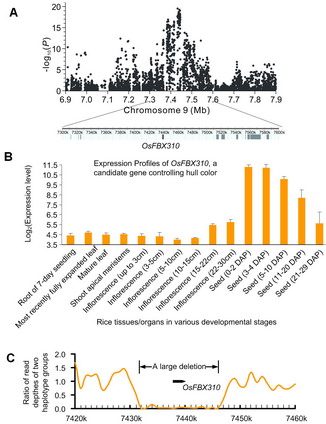 图2:通过GWAS定位的控制水稻种壳颜色的候选基因及其表达模式和变异分析
