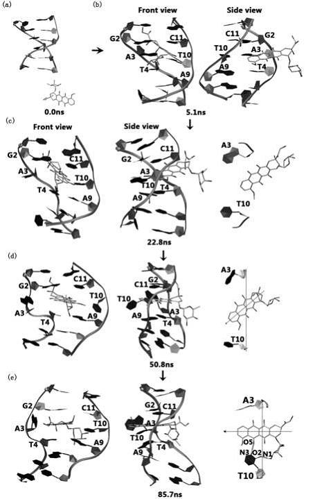 近日,中国科学院北京基因组研究所雷红星研究组开展的“抗癌药物的分子机制研究”取得阶段性进展,其研究论文《Early stage intercalation of doxorubicin to DNA fragments observed in molecular dynamics binding simulations》,于2012年6月在《Journal of Molecular Graphics and Modelling》杂志发表。该文采用分子动力学的方法研究了阿霉素分子从自由状态到嵌入DNA碱基片段的动态过程,提出了一个新的药物分子插入机制(打开-插入机制),即插入过程是经外部结合后伴随着碱基对的打开(base-flipping)进行的,这一新机制的提出对于抗癌药物分子机制研究起到了积极的推动作用,为设计更有效的抗癌药物提供了理论依据。