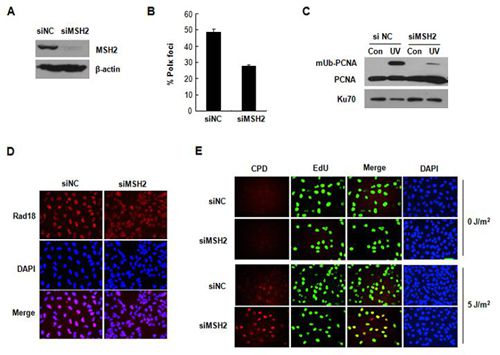 MSH2一方面通过影响泛素连接酶RAD18与染色质的结合来调控PCNA单泛素化水平进而影响TLS聚合酶招募, 另一方面MSH2也可在敲低Rad18的细胞中通过PCNA单泛素化不依赖的方式,上调TLS聚合酶在受阻复制叉处的富集。进一步研究发现,MSH2能够促进紫外辐射后细胞跨越基因组上光产物损伤的TLS过程,表明了MSH2在紫外光损伤处理后细胞应答方面具有新的作用。