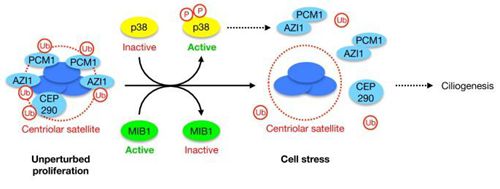 研究人员还发现,E3泛素连接酶MIB1是中心粒卫星的一个新组分,与AZI1PCM1共同作用并对这两个蛋白进行泛素化,抑制初级纤毛的形成。而在细胞应激反应中, MIB1被迅速灭活,导致AZI1PCM1CEP290非泛素化。该研究结果发现了通过耦合依赖于P38的磷酸化和MIB1催化纤毛发生因子的泛素化的中心粒卫星重组新机制。