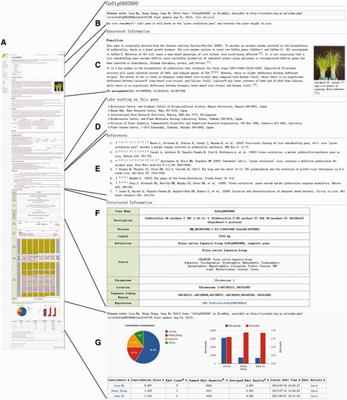 目前,RiceWiki已经整合了两个水稻栽培亚种的基因数据(O. sativa indica 93–11 O. sativa japonica Nipponbare),涵盖66000多个水稻基因的相关信息。水稻基因的原始资料主要来源于RefSeq NCBI),EnsemblRAP-DBMSU Rice Genome Annotation Project。每个水稻基因的资料由注释信息、研究该基因的相关实验室以及参考文献和结构信息构成。