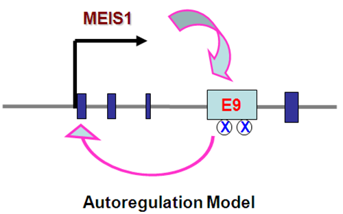 研究人员应用生物信息学预测并结合定点突变方法进一步探索增强子介导的MEIS1持续活化的机制,最终发现MEIS1是通过激活增强子E9来实现在白血病中的持续高表达。该研究揭示了转录因子MEIS1通过远端增强子调控自身表达水平的机制,为深入开展白血病的转录调控机理研究奠定了良好基础。