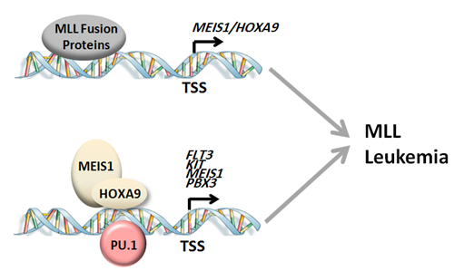 该研究发现,与以往研究中转录因子PU.1t(8;21)t(15;17)急性白血病中“抑癌基因”的作用相反,PU.1MLL白血病中高表达,并证实了PU.1在小鼠MLL白血病模型中具有诱发和维持肿瘤细胞生长的作用,而且PU.1不是MLL融合蛋白的下游靶基因。