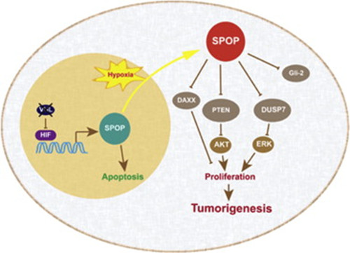 课题组近期的研究结果显示,核蛋白SPOP 在肾癌组织中过量表达并错误定位在细胞质里。肾癌中,过度活化的缺氧诱导因子HIF可以转录调控SPOP表达。低氧微环境可以驱使过表达的SPOP蛋白在肾癌细胞质中大量累积。与核定位SPOP 的促凋亡功能不同,胞质型SPOP 能加速细胞增殖。通过生物信息分析和实验验证,发现胞质中的SPOP与肿瘤抑制因子PTEN 和ERK 磷酸酶DUSP7 相结合,并通过泛素化通路使其降解,从而激活了PI3K-Akt和ERK信号通路。此外,肾癌中SPOP还通过降解Daxx和Gli2来抑制细胞凋亡和促进细胞增殖,从而导致肿瘤产生。相反敲除SPOP后能特异性杀死肾透明细胞癌,但对正常细胞影响较小。