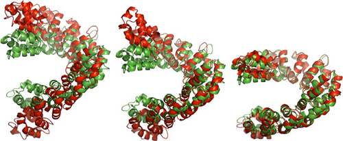 三个具有代表性的分子动力学模拟轨迹。其中红色为模拟的结构,绿色为TALE蛋白结合DNA的参照结构