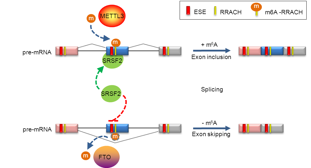 依赖于m6A去甲基化酶FTO的mRNA m6A修饰促进外显子剪切增强子结合蛋白SRSF2对RNA的结合能力,