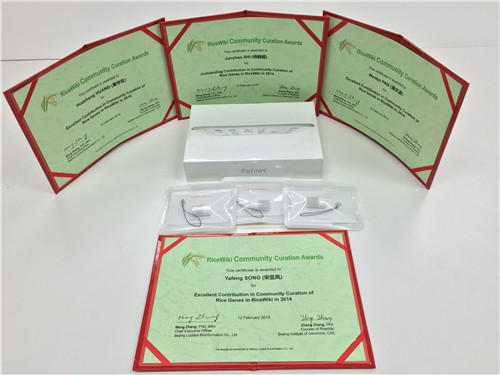 大众审编是生物大数据整合和相关文献信息集成的重要方法之一,为鼓励更多科研人员以及学生参与RiceWiki水稻基因的大众审编工作,进一步推广RiceWiki的基因注释理念与模式以及促进我国面向生物大数据的基础性研究人才培养,RiceWiki团队秉承公平、公正、公开的原则对2014年度参与RiceWiki水稻基因审编的人员给予评选与奖励,依据年度总贡献值(Contribution Score)评选出2014年度四位重要贡献者。2015年3月4日,基因组所章张研究员和本次评选活动奖品赞助商北京路思达生物信息科技有限公司CEO张猛博士,共同为到场获奖者侍骏超和潘文波颁发奖品与证书,对未能到场的获奖人员,RiceWiki团队为其邮寄了奖品与证书。