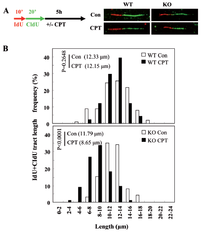 本研究首先回转REV1到敲低细胞证实了REV1确实直接参与HR,进而通过特异设计的报告系统发现了REV1参与复制依赖的HR;利用激光显微辐射系统在细胞核内定点诱发DNA双链断裂(DSBs),发现REV1可以被招募到DSBs,这种招募依赖于REV1泛素结合结构域、RAD18及单泛素化的FANCD2;在RAD18敲低的稳定细胞系中表达FANCD2-Ub嵌合体蛋白会增加REV1在DSBs的招募,揭示单泛素化的FANCD2作为RAD18的下游蛋白负责招募REV1到损伤位点;此外,REV1在激光造成的DNA损伤位点处的招募还受BRCA1和BRCA2调控;特别地,利用IdU和CIdU标记新合成的DNA链,通过DNA fiber实验发现在羟基脲或喜树碱处理后,REV1能保护新生DNA链不被核酸酶降解,维持受阻复制叉的稳定。