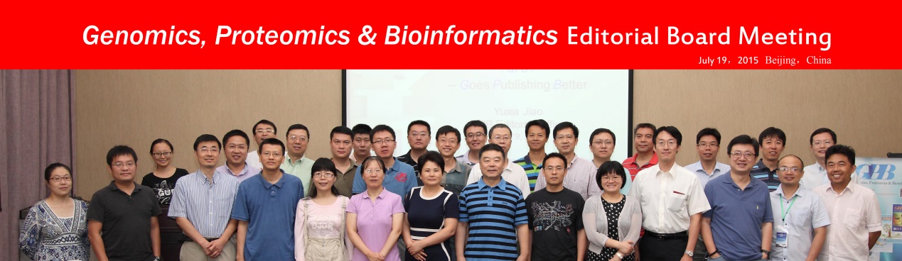 2015年7月19日,由中国科学院北京基因组研究所与中国遗传学会主办的英文学术期刊——Genomics, Proteomics & Bioinformatics (《基因组蛋白质组与生物信息学报》,简称“GPB”),借承办基因组学前沿研讨会之机,在北京亚奥国际酒店召开了自2003年创刊以来最大规模的编委会议,共有29位编委参会,其中包括多位来自国内外的前沿研讨会受邀报告人。会议由本刊主编于军博士主持,围绕GPB当前发展的情况和亟待解决的问题进行了热烈讨论。