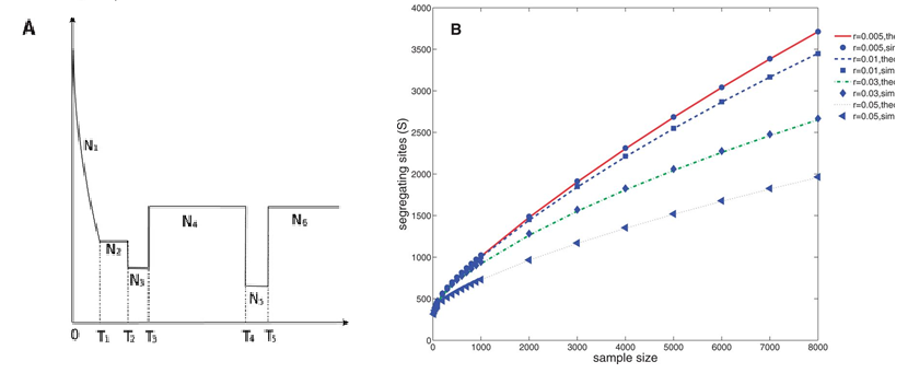 TNSFS方法能有效模拟复杂的群体模型(如图A所示,用于描述欧洲群体变化的Gazave模型), 并且在不同参数值下的理论预测值与电脑仿真产生的结果吻合(图B)