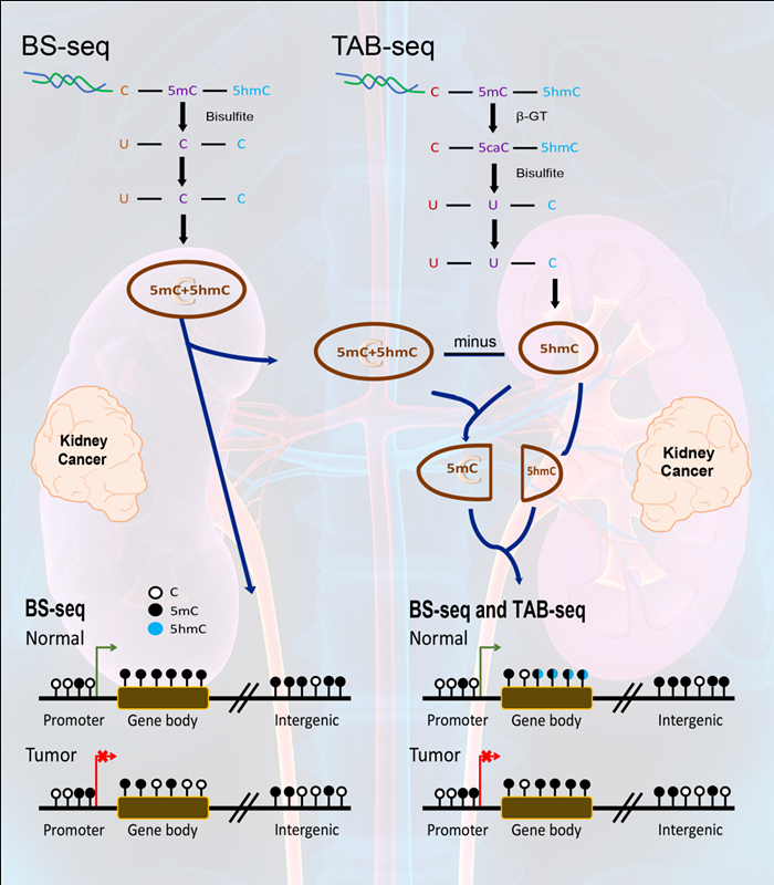 透明肾细胞癌(clear cell Renal Cell Carcinoma, ccRCC)是肾癌中最常见的亚型,90%以上的ccRCC患者中VHL抑癌基因是失活的,但在小鼠实验中却发现该基因的缺失并未能引起透明细胞癌形成,这意味着还存在其他的致瘤机制。近些年的研究发现,与肾癌发生发展、患者总体生存率以及预后相关的基因突变主要集中在表观调控因子上,这表明表观遗传变异对肾癌的发生发展起到了重要的作用。长期以来由于技术的限制,以前研究观察到的全基因组甲基化修饰包含了5-甲基胞嘧啶(5-mC)和5-羟甲基胞嘧啶(5-hmC)两部分修饰的总和,并不知道它们各自真实的修饰水平、相互调控关系及其生物学意义。