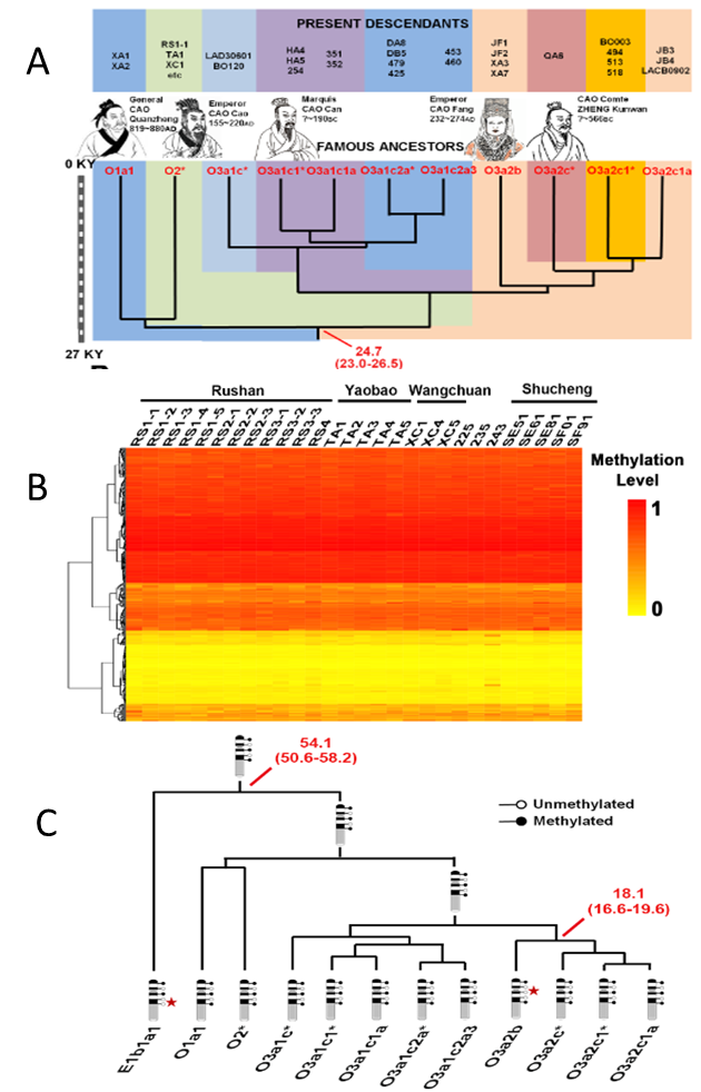 男性人群Y染色体上DNA甲基化继承性研究(图A. Y染色体单倍型及分化时间信息;图B. 人群Y染色体DNA甲基化水平对比分析;图C. Y染色体DNA甲基化信息继承模式图)