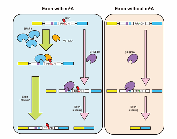 中科院北京基因组研究所精准基因组医学重点实验室及遗传与发育协同创新中心杨运桂课题组在研究m6A甲基化修饰调节mRNA选择性剪接规律过程中,发现了读码器YTHDC1通过招募前体mRNA剪接因子SRSF3同时抑制剪接因子SRSF10与RNA的结合,促进外显子被保留的分子机制。该研究结果于2016年2月在Molecular Cell 杂志在线发表。
