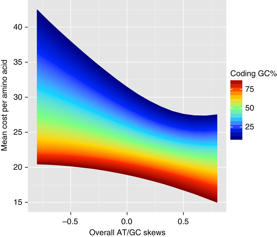除研究本身所揭示的现象之外,该结果还在进化生物学领域有广泛的影响:从能量利用的角度上看,所有突变都会受到选择;G+C的价格高于A+T;同时高GC%的密码子编码出来的氨基酸更便宜。也就是说,基因组的GC含量( GC-content )决定了细胞能量在RNA和蛋白质之间的分配。低GC%的物种中,蛋白质较贵,会占用更多的细胞资源。这就意味着低GC%的基因组没办法负担很多的编码基因;这也解释了为什么低GC%的物种基因组往往较小,而高GC%物种的基因组可以较大。