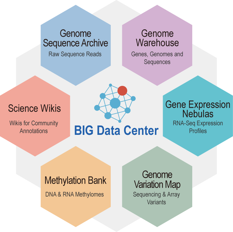 生命与健康大数据中心建成面向国家大数据发展战略的多层次生物组学数据资源系统,包括基于高通量测序的原始组学数据归档库(Genome Sequence Archive,GSA),围绕国家重要战略生物资源的基因组组数据库(Genome Warehouse,GWH),基于测序数据的基因表达数据库(Gene Expression Nebulas,GEN),基于中国人群以及国家重要物种群体的基因组变异数据库(Genome Variation Map,GVM),基于全基因组DNA甲基化图谱的表观基因组数据库(Methylation Bank,MethBank)以及基于大众审编(Community Curation)的生命科学维基知识库(Science Wikis),初步形成我国生命与健康数据汇交与共享平台,具备可服务于全球的基因组数据共享网络。