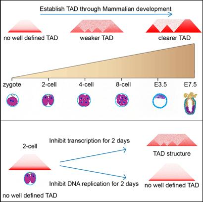 哺乳动物配子和早期胚胎的数量非常有限,研究团队解决了使用少量细胞建立3D染色体结构图谱的难题,从而获得小鼠精子、卵子和早期胚胎的高分辨率染色体高级结构图谱。研究结果显示成熟的卵子没有拓扑结构域(TADs),而在精子中普遍存在超远程染色体的相互作用。发现受精卵和2细胞时期胚胎中染色体高级结构几乎不存在,随着发育的进行,染色体高级结构逐渐的建立起来。并发现染色体高级结构的建立不依赖于受精卵基因组转录的激活、而是依赖于基因组的复制。除此之外,本研究首次发现染色体的高级结构与DNA甲基化的关联,并且发现早期发育的DNA去甲基化也与染色体的高级结构相关。