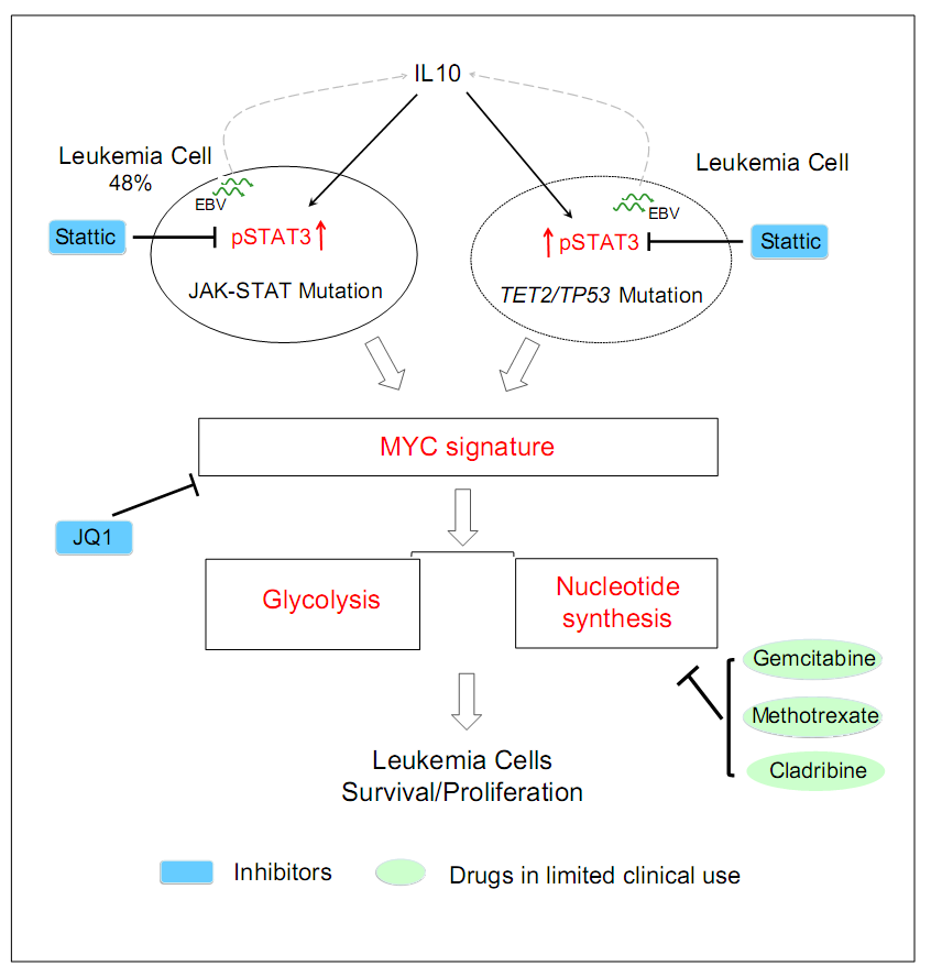 研究团队对近50例中国ANKL患病人群进行基因组、转录组以及代谢组的整合分析,结果显示JAK/STAT信号转导通路的基因在NK细胞白血病中频繁发生突变。突变增强了JAK/STAT的信号传递功能,促使下游能够控制细胞代谢水平的MYC基因活化,进而一批参与代谢功能的基因过量的表达,NK白血病细胞呈现了代谢极其旺盛的特点(核苷酸和糖的代谢最突出);研究人员进一步通过疾病模型的一系列功能研究,证实了上述发现。除此之外,研究者还发现了在NK细胞白血病中携带能够修改遗传物质的表观修饰基因的突变,如TET2等基因。
