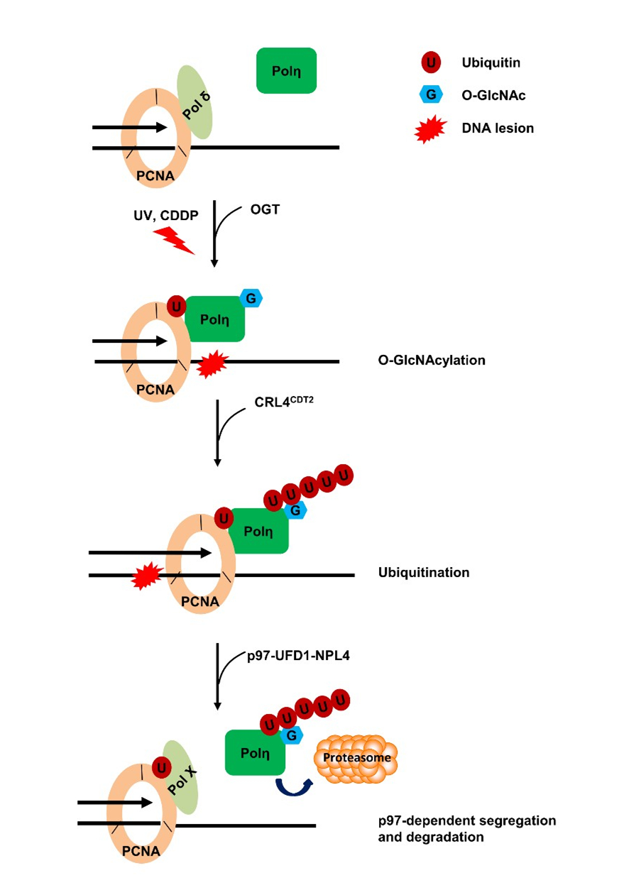 O-GlcNAc糖基化修饰调控Polη与复制叉解离的分子机制示意图