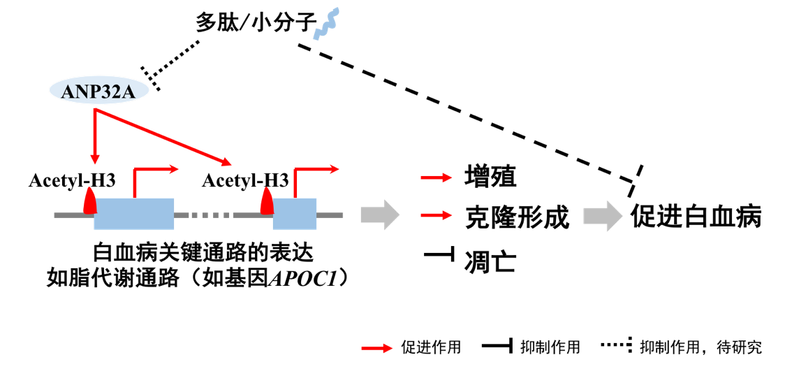 该研究首次揭示了ANP32A在白血病中作为致癌因子发挥功能;ANP32A蛋白只有249个氨基酸,结构适合利用小分子抑制剂或多肽有效干扰其功能,有望通过靶向ANP32A调节异常升高的acetyl-H3修饰,提高白血病疗效。