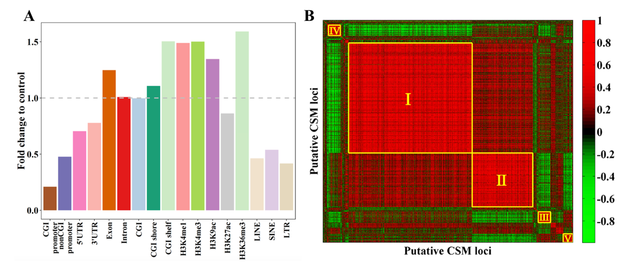 (A) CSM位点在不同基因组特征区域上的富集分布;(B) 两两CSM位点的皮尔森相关系数热图,前五