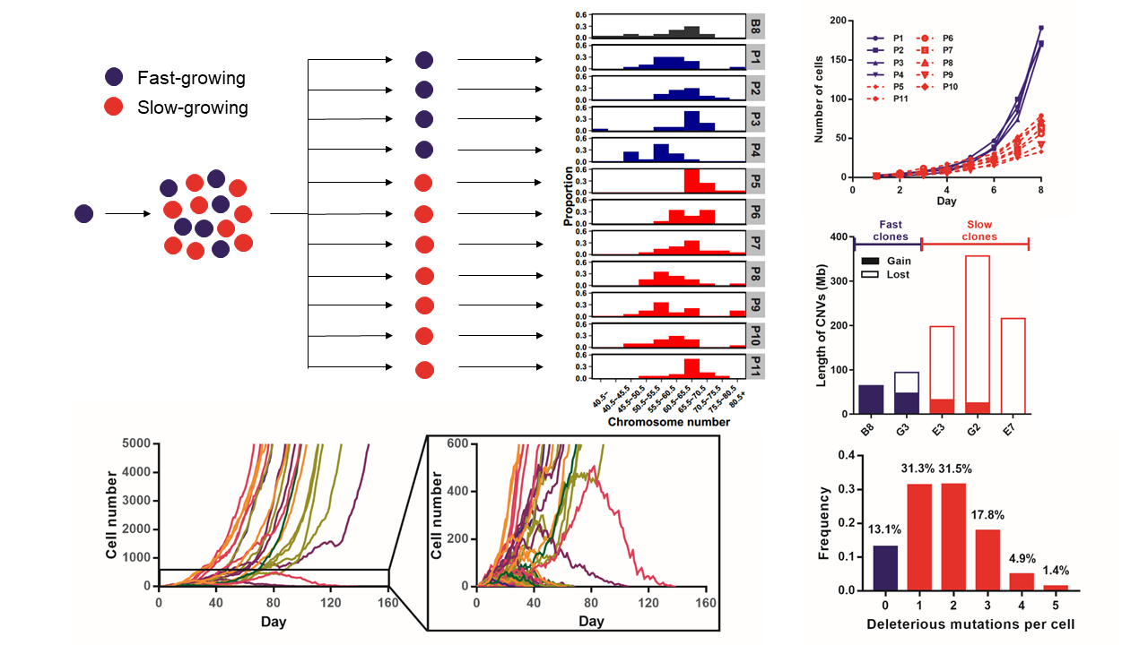 研究人员从宫颈癌HeLa细胞系中选取单细胞进行克隆培养,通过多个单细胞克隆培养发现,细胞已经发生染色体倍型和生长速率异质性;大部分细胞系相对于祖先细胞生长速率有了明显下降。通过全基因组测序,生长速率较慢的细胞系拷贝数变异(copy number variation)数量显著多于生长速率较快的细胞系。通过对染色体核型的分析,发现生长速率较慢的细胞染色体数量显著升高。随后研究人员计算了有害突变的突变率,得到HeLa细胞系单次分裂平均产生0.29个有害突变,每增加一个有害突变会使肿瘤细胞的生长速率下降18%,得出平均每一代群体的适应度下降~5%0.29×0.18),远高于此前在其它物种中的估计,验证了肿瘤生长会承受很高的遗传负荷(genetic load)。最后,为了回答肿瘤群体如何避免被消亡(mutational meltdown)的问题,研究人员利用已估计的参数模拟肿瘤从单细胞开始生长的过程,通过多次模拟,仅有不到10%克隆存活,即使在存活的群体中,大部分细胞的适合度(fitness)相比他们祖先细胞有明显降低。但群体中没有携带任何有害突变(mutation free)的细胞数量也一直增加,而这些细胞可以使肿瘤群体免于消亡的危险。