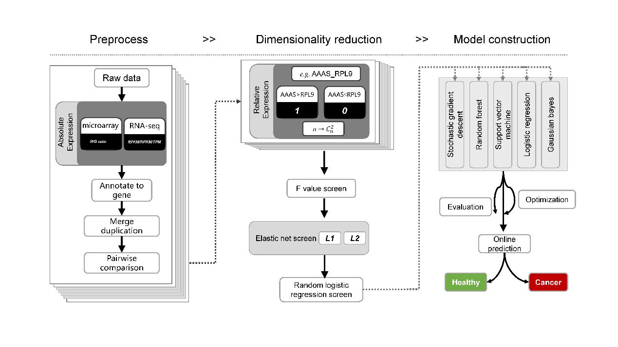 肿瘤是系统性疾病,在肿瘤发生发展过程中,除病灶位置外,外周血中多种细胞的表达量也发生变化,这使得我们有机会通过外周血在分子层次实现对肿瘤的追踪。研究人员整合公共数据库中上千例正常和乳腺癌个体外周血转录组数据,通过创新性的秩归一化方式屏蔽不同转录组检测平台、不同批次之间的噪音,并通过人工智能方法实现高维数据特征筛选和模型构建。在模型验证过程中,研究人员发现模型具有良好的泛化能力,在RNA-seq、不同芯片平台以及不同人种之间都取得了很好的预测效果。