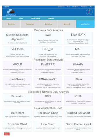 eGPS软件包括单机软件版本eGPS Desktop和云计算eGPS Cloud,能够在不同平台下运行,且利于开发,易于应用。通过eGPS Cloud,将基因组分析、群体数据分析、进化数据分析、网络分析以及图形可视化这五部分的分析有机整合起来,实现远程云计算功能,方便用户在缺乏计算资源的情况下快速获得运算结果,并最终以图形、图表等形式直观展示。通过eGPS Desktop,用户无需上传数据即可分析基因组学和蛋白质组学数据。同时eGPS Desktop还拥有完善的进化分析流程。比如可以直接从基因组序列比对建立物种树。在eGPS Cloud和其他开放式在线资源的支持下,eGPS Desktop提供了一键点击从候选基因到基因树的分析流程。egps结合了云计算和桌面应用的优势,具有用户友好的图形界面和高度的交互能力。