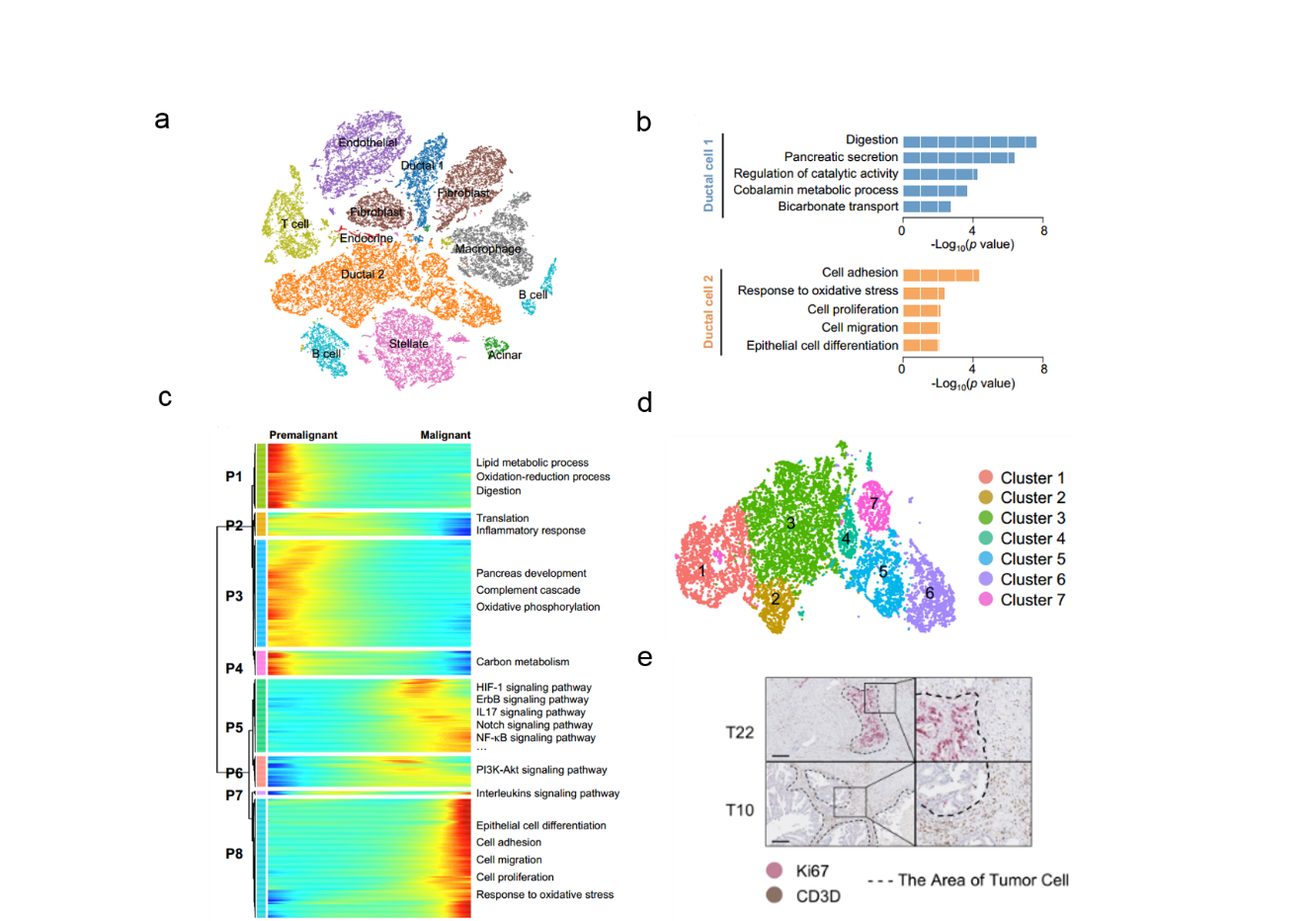 研究团队通过对24例术前未经放化疗的人胰腺癌组织的41986个细胞及11例对照胰腺组织的15544个细胞进行单细胞转录组分析,绘制了大样本人胰腺导管腺癌细胞图谱。首先,通过t-SNE 分析鉴定出胰腺癌组织中10类细胞:I型导管细胞、II 型导管细胞、腺泡细胞、内分泌细胞、内皮细胞、成纤维细胞、星型细胞、巨噬细胞、T细胞和B细胞。通过CNV结合差异分析和功能富集,鉴定II型导管细胞是胰腺癌组织的恶性细胞。其次,利用轨迹分析研究了PDAC从癌前状态到恶性状态的基因表达模式,发现在PDAC进展过程中,包括ErbB和Notch信号通路在内的多个经典致癌通路被激活。特别是在肿瘤进展的晚期,细胞增殖和迁移的相关基因被显著激活。另外,团队在II型导管细胞中鉴定出具备高增殖、高转移潜能等在内的七个细胞亚群。其中,亚群7(增殖性导管亚群)的特征基因富集在细胞周期和细胞增殖相关通路。进一步,结合TCGA数据库的PAAD数据集进行整合分析发现,肿瘤组织中增殖性导管细胞亚群特征基因的表达水平与肿瘤浸润T细胞的激活存在显著的负相关性,病理切片染色也证明了这两群细胞数量的关联性,提示增殖性导管细胞的存在和活化T细胞的缺失可能共同导致PDAC患者的不良预后。