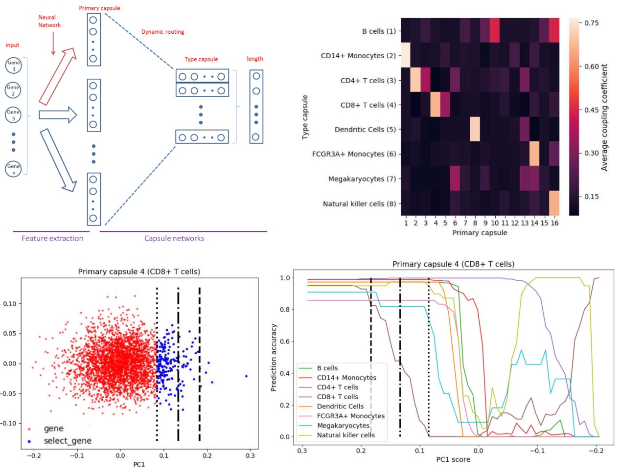 近日,中国科学院北京基因组研究所(9323彩票)蔡军研究组、北京师范大学张江研究组合作在Nature Machine Intelligence发表了题为An interpretable deep-learning architecture of capsule networks for identifying cell-type gene expression programs from single-cell RNA-sequencing data的研究成果,构建了决策过程可解释的深度学习网络模型,单细胞胶囊网络(single cell Capsule Network, scCapsNet),并用于单细胞转录组分析。相对于其他单细胞转录组自动分析工具,单细胞胶囊网络能更稳定更高效地分辨出属于新细胞类型的细胞。并且,单细胞胶囊网络能通过模型的内部参数找出细胞类型相关基因。通过细胞类型相关基因,单细胞胶囊网络能将基因与细胞类型直接联系起来,极大地提高了深度学习模型的可解释性。本质上,单细胞胶囊网络将基因的表达特征和细胞类型特征进行低维编码,这样的编码富含生物学意义。