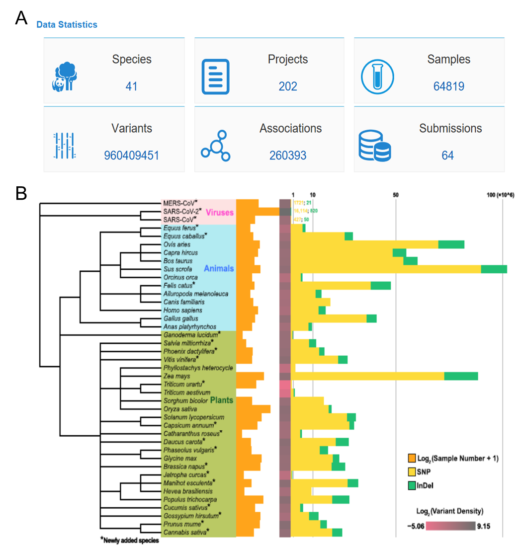 GVM数据库(A)六大数据模块及数据量(B)各物种变异数据量及密度统计图