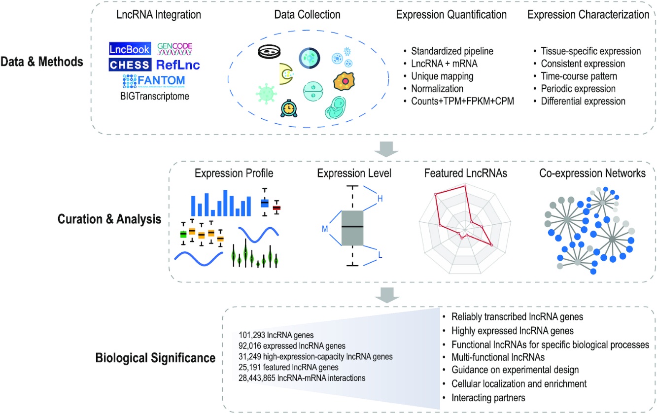 LncExpDB数据库致力于提供多生物学场景的lncRNA表达谱,鉴定具有潜在功能的lncRNA,促进lncRNA的功能实验研究。在LncBook数据库构建的人类lncRNA数据集基础上,研究人员整合CHESS、RefLnc、FANTOM等10余个专业数据库鉴定的lncRNA,基于严格审编标准,获得全面的高质量人类lncRNA参考数据集,包含101,293个基因/33,1244个转录本。LncExpDB数据库进一步整合9种重要生物学场景(正常组织/细胞系、器官发育、植入前胚胎发育、细胞分化、亚细胞定位、外泌体、癌症细胞系、病毒侵染、昼夜节律)的1,977个样本的转录组数据,通过标准化的转录组数据分析流程,系统分析并鉴定每种生物学场景的特征基因(管家基因/组织特异性基因、差异表达基因、节律基因、动态表达基因、亚细胞区室富集基因)集合,共计25,191个特征lncRNA基因和28,443,865对相关的lncRNA-mRNA共表达关系。此外,LncExpDB鉴定了具有表达证据支持的92,016个lncRNA基因,评估了lncRNA的表达水平与表达潜力。