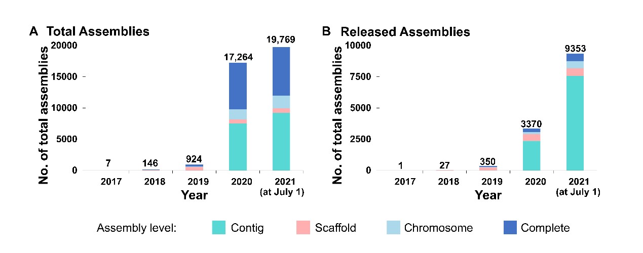 截至2021年7月1日GWH收录的基因组组装数据统计