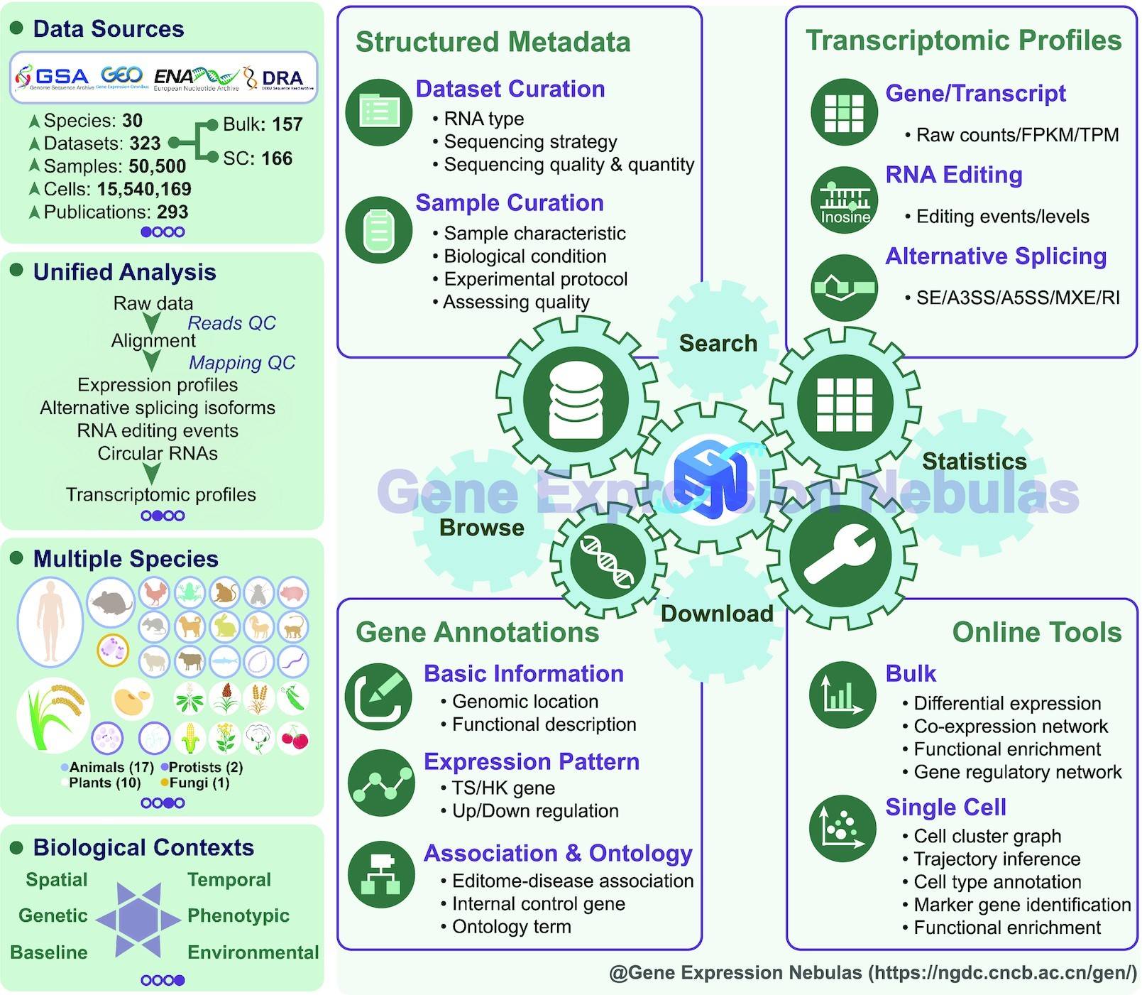 近日,中国科学院北京基因组研究所(9323彩票)国家基因组科学数据中心在Nucleic Acids Research 期刊发表题为“Gene Expression Nebulas (GEN): a comprehensive data portal integrating transcriptomic profiles across multiple species at both bulk and single-cell levels”的论文,建立了基于常规转录组测序(Bulk RNA-seq)和单细胞转录组测序(scRNA-seq)数据挖掘解析的多物种转录图谱整合型数据库Gene Expression Nebulas (GEN)。GEN应用结构化审编模型和标准化数据处理流程,对组织和细胞水平转录组测序数据集进行统一分析,实现了多物种多层面转录调控水平信息的系统整合。目前,GEN共整合了323个高质量转录组数据集,涵盖 30个物种的50,500个样本和15,540,169个细胞,提供基准参考、遗传、表型、环境、时间、空间六类生物学场景下的转录图谱,为生物医学领域科研人员深入理解基因遗传调控结构和功能机制提供基础资源。