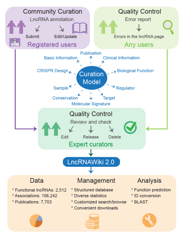 LncRNA通过复杂多样的分子机制发挥重要功能,在多个生物学过程发挥重要作用,与人类疾病的发生发展密切相关。LncRNAWiki是一个基于MediaWiki框架开发的人类lncRNA群体审编知识库,最初注释了86个文献报道的lncRNA。此后,研究团队每年持续增加新的功能性lncRNA并丰富lncRNA注释。截至2020年,LncRNAWiki已包含2,056个功能性lncRNA的注释信息,为了解lncRNA的功能和研究进展提供了重要的资源平台。
