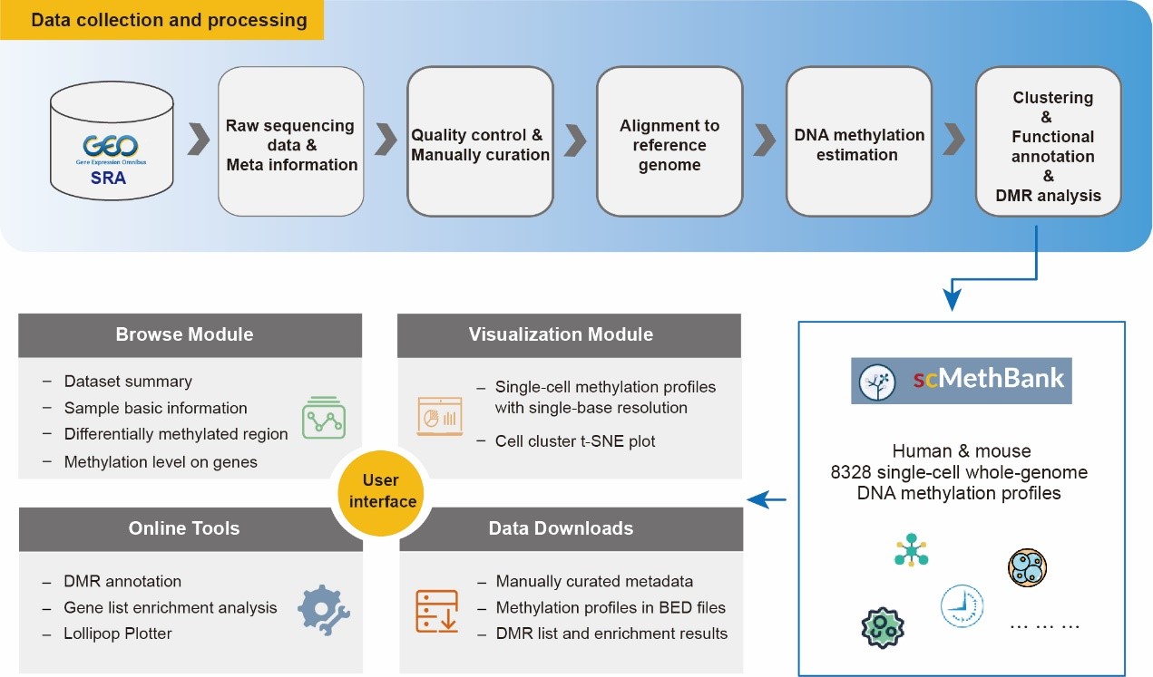 作为表观基因组学的重要组成部分,DNA甲基化为研究基因组印迹、早期胚胎发育和癌症进展等生物学过程提供了重要视角。随着单细胞测序技术的不断发展,在单细胞分辨度研究DNA甲基化成为可能,也极大地促进了细胞表观遗传异质性的探索。然而,由于缺乏完善的标准化数据分析技术及流程及相应的单细胞甲基化数据资源平台,对于不同实验来源的海量的单细胞甲基化样本数据的整合和再利用面临着巨大的挑战。针对这些问题,国家基因组科学数据中心研究团队开发了scMethBank数据库。
