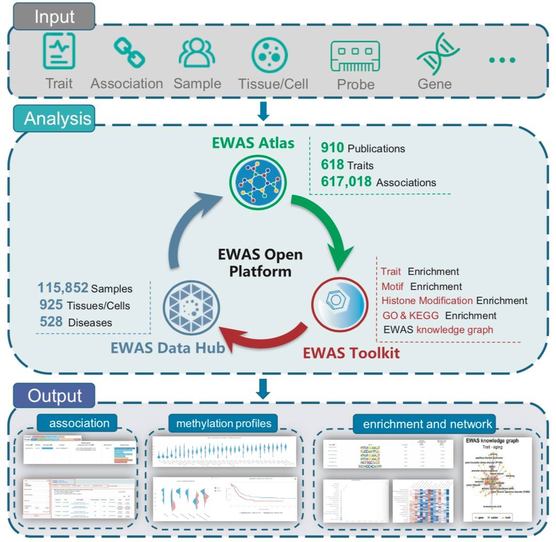 为了提供从数据浏览与下载、在线分析与可视化到知识解释与验证的全面系统的资源和服务,NGDC研究团队在不断整合和更新中心已有EWAS资源基础上,构建了表观组关联研究资源开放平台(EWAS Open Platform)。EWAS Open Platform包括标准化的数据信息库 (EWAS Data Hub)、人工信息提取的知识库(EWAS Atlas)和表观-特征关联在线工具(EWAS Toolkit) 三部分。EWAS Data Hub整合了115,852个样本的DNA甲基化芯片数据和对应的元数据,并统一采用GMQN方法进行标准化。同时,EWAS Data Hub利用海量高质量DNA甲基化芯片数据和标准化元数据的优势,为485,512个探针和36,397个基因提供了一系列重要的评估值(包括组织特异性、年龄相关性、性别差异和种族特异性)和不同背景下的参考DNA甲基化图谱;EWAS Atlas共整合了910篇文献中报道的617,018个高质量的甲基化与表型关联,涉及到618种表型和3,385个队列;EWAS Toolkit利用EWAS Atlas和EWAS Data Hub提供的高质量的甲基化与表型关联知识和标准化的DNA甲基化芯片数据,为用户提供多种在线分析和可视化工具,包括富集分析、注释、知识图谱可视化等。