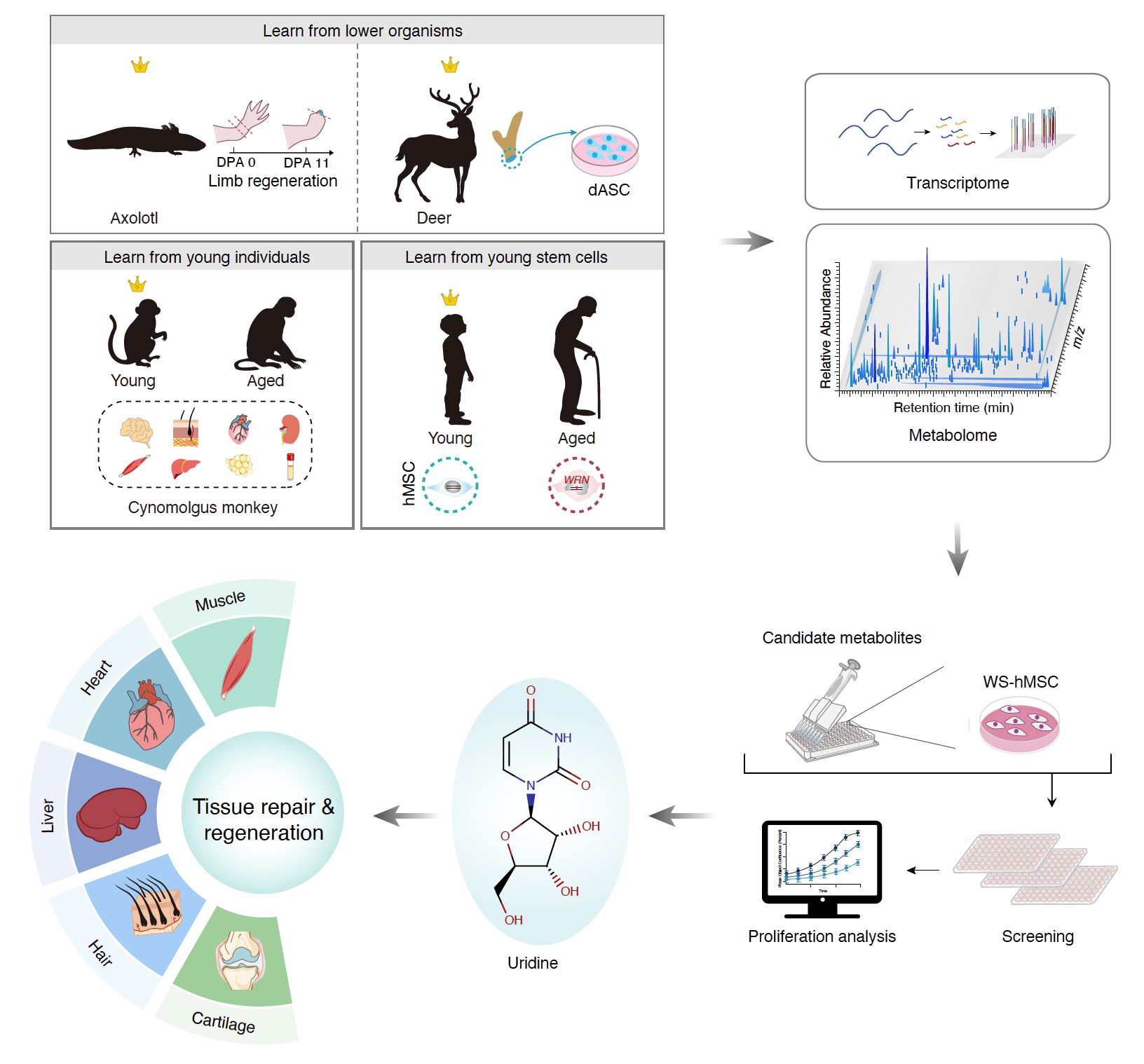 2022年2月1日,中国科学院北京基因组研究所张维绮研究组同中国科学院动物研究所刘光慧研究组、曲静研究组等合作,于Cell Discovery杂志在线发表题为“Cross-species metabolomic analysis identifies uridine as a potent regeneration promoting factor”的研究论文。该研究深度解析了跨物种、跨年龄、跨组织的代谢分子特征,首次绘制了多物种不同年龄多组织的内源性代谢物的全景图谱,解码了强再生能力伴随的分子代谢通路,发现尿苷是一种能延缓人类干细胞衰老、促进哺乳动物多组织再生修复的关键代谢物。