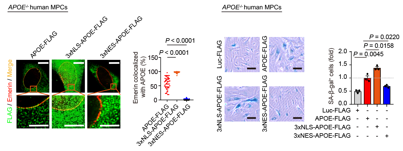 研究人员发现,APOE的蛋白水平在多种人类干细胞衰老模型中均发生上调,提示APOE与人干细胞衰老调控的潜在联系。进一步研究显示,过表达APOE能够加速人干细胞衰老,而CRISPR/Cas9介导的APOE敲除可以延缓人干细胞衰老,说明APOE的聚积是细胞衰老的新型驱动力。机制分析表明,细胞核内的APOE可与内层核膜蛋白LBR、Emerin以及异染色质蛋白KAP1形成蛋白复合物。APOE通过自噬-溶酶体途径促进核膜蛋白和异染色质组分的降解,破坏核周异染色质的稳定性,进而导致基因组重复序列的去抑制及异常高表达,驱动人干细胞衰老。研究人员还发现,在多种人类细胞模型中敲低APOE均能延缓细胞衰老,说明APOE可作为减轻衰老及衰老相关病理的潜在分子靶标。