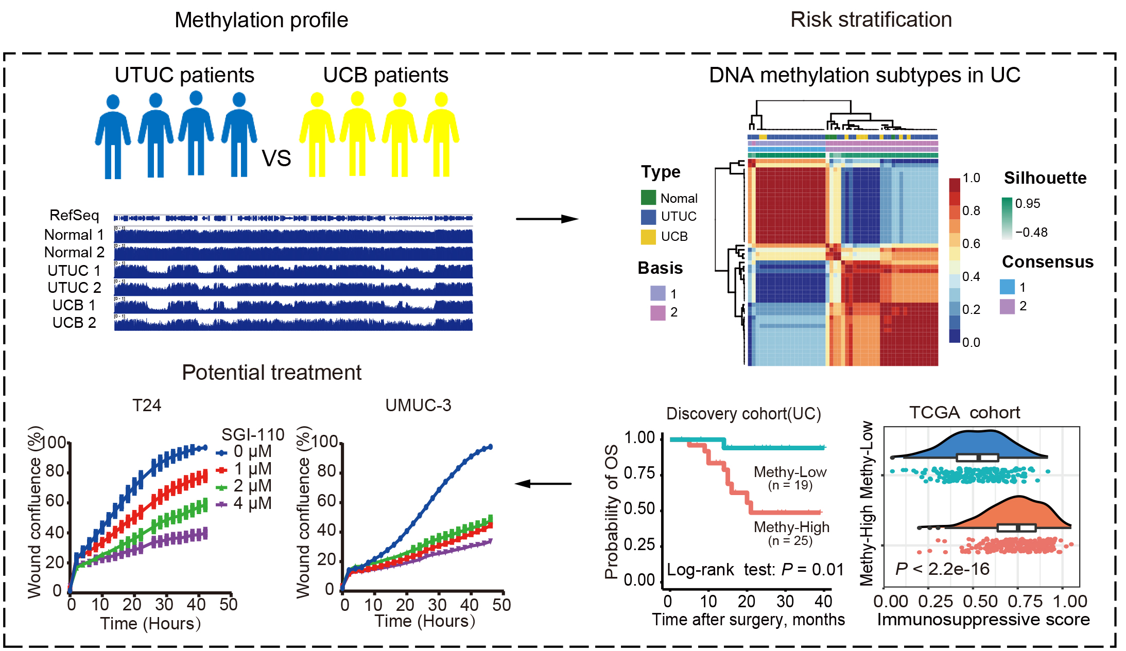 该研究收集了上尿路上皮癌旁组织、上尿路上皮癌和膀胱癌组织共49例。通过整合全基因组甲基化和转录组数据,发现上尿路上皮癌和膀胱癌的DNA甲基化图谱非常相似,通过对肿瘤的DNA甲基化模块进行非负矩阵分类鉴定出两种与预后相关的亚型(Methy-High和Methy-Low),并通过86例上尿路上皮癌及411例TCGA膀胱癌两个公共数据集进行了验证。其中,Methy-High亚型是高甲基化,免疫浸润,耗竭状态的T细胞和免疫抑制微环境,临床预后较差。值得一提的是,DNA甲基化亚型是一个新型独立预后指标。研究还发现,DNA甲基转移酶抑制剂SGI-110通过上调多种抗肿瘤免疫通路抑制Methy-High 亚型膀胱癌细胞系的迁移和侵袭。