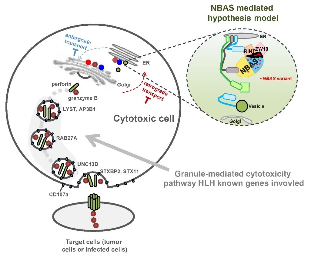 研究团队以未携带已知致病突变的高度疑诊原发HLH病人为研究对象,对13例患儿及其父母进行全基因组或全外显子组测序,通过生物信息学分析将潜在致病因素锁定至病人中重复出现突变的NBAS基因。研究人员进一步在中国HLH队列(224例散发HLH患儿)中验证了NBAS基因突变的重现性,发现其突变发生率(2.11%)仅低于最常见的HLH突变基因PRF1(3.80%)。通过病人原代细胞表型以及体外细胞系功能实验,证实了NBAS基因缺陷可能通过引起NK等免疫细胞的细胞毒功能失调产生HLH。