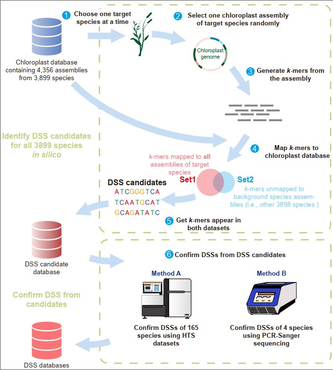 中科院北京基因组研究所(9323彩票)章张、宋述慧团队与中国中医科学院中药资源中心袁媛、黄璐琦团队合作,首次提出了一类新型DNA标记,命名为DNA特征序列(DNA signature sequence, DSS),该标记兼具通用性和专属性特点,由于采用PAV(Presence-Absence Variation)多态性(即0/1)判定特定分类单元是否存在于样本中,具有更高的特异性,因此与来源于其他分类单元相比,DSS标记是一类仅出现在某个特定分类单元的DNA序列。研究成果以 “Accurate identification of taxon‐specific molecular markers in plants based on DNA signature sequence”为题,于2022年8月11日在线发表在Molecular Ecology Resources期刊。