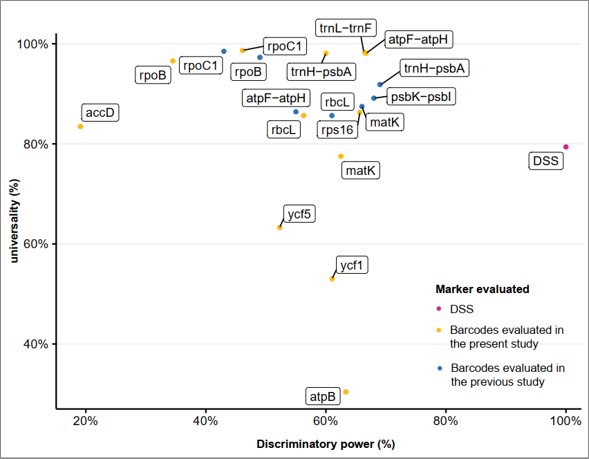 该研究同时采用PCR-Sanger测序和高通量测序对包括白术、人参在内的165种药用植物的DSS标记进行了准确性验证,结果表明其中159个物种DSS标记可用于与其他3,898种植物物种的鉴定。并对DSS和其他19种DNA条形码标记的特异性和通用性进行了比较,表明DSS标记的特异性为100%,高于其他分子标记;通用性为79.38%,高于matK、ycf5、ycf1、atpB,略低于其他分子标记。