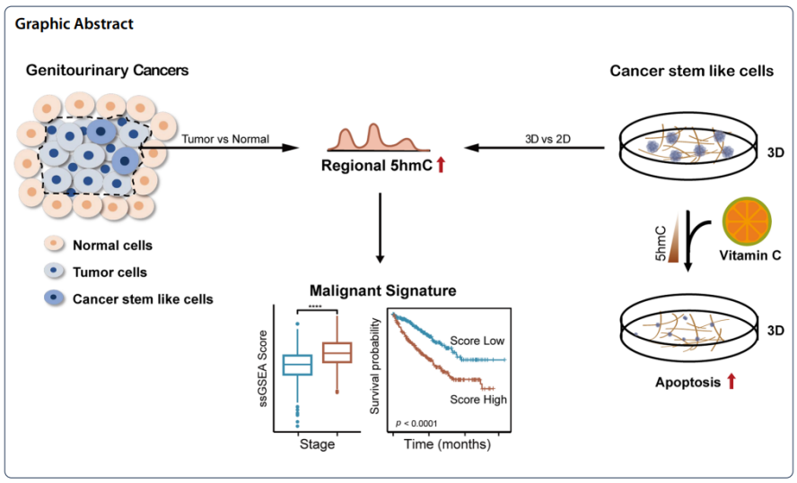 该研究通过应用一种灵敏的基于免疫沉淀的方法 (hMeDIP-seq) 来分析泌尿生殖系统(包括前列腺、尿路上皮和肾脏)肿瘤发生过程中的5hmC变化,证实了5hmC在泌尿生殖器组织中的组织特异性分布,并确定了5hmC在泌尿生殖器癌症中发生了区域性增加和整体水平的下降,且区域性升高的基因在调节干性和缺氧方面较为富集,并都与不良的临床预后相关。通过与传统的二维(2D)刚性培养皿相比,在软纤维蛋白凝胶诱导的3D肿瘤球体中发现细胞具有肿瘤干细胞样表型,并且在两种前列腺癌细胞系22RV1和PC3中发现5hmC的水平升高。通过合并3D体系培养的细胞和组织的5hmC富集的基因,定义了一个癌症干细胞样细胞的恶性特征,这可以预测更差的临床结果并确定来自前列腺癌肿瘤的表型恶性细胞群。值得注意的是,抗氧化维生素C衍生物抗坏血酸磷酸镁可恢复5hmC并导致前列腺癌细胞系凋亡,从而杀死癌症干细胞样细胞。通过使用5hmC重编程药物维生素 C 可以对前列腺癌进行表观遗传分化治疗。