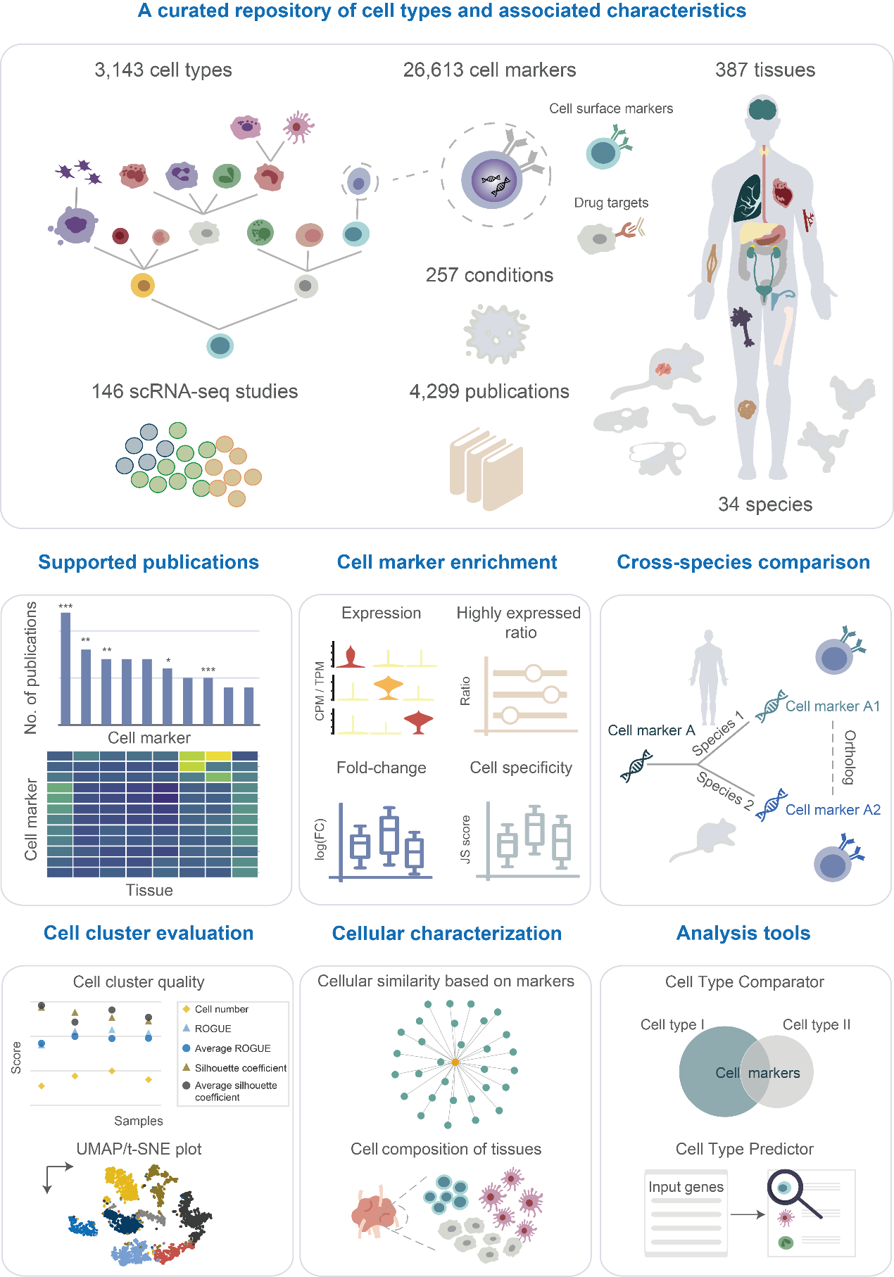 Cell Taxonomy基于4,299篇文献审编、15个相关数据资源整合和单细胞测序数据分析(约350万个细胞),目前共收录3,143种细胞类型和26,613个细胞标志物(cell marker),涵盖34个物种、387种组织和257种生理/病理状态。Cell Taxonomy从多方面系统表征细胞类型特征,包括细胞标志物和细胞群(cell cluster)质量评估、细胞类型跨物种比较、细胞组分刻画和细胞相似性定量。为更好的帮助用户注释和比较细胞类型,Cell Taxonomy开发了在线工具Cell Type Predictor和Cell Type Comparator。